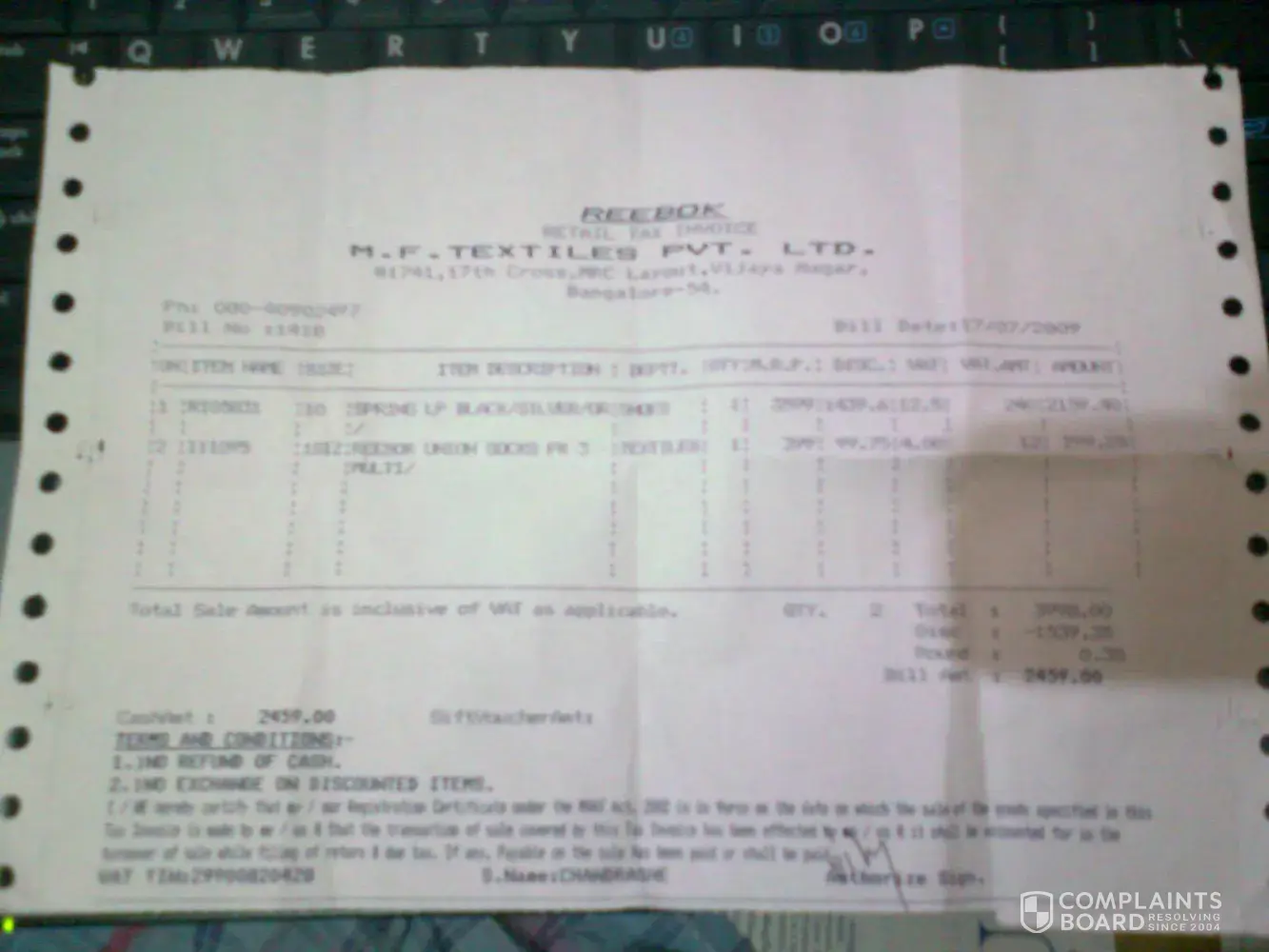 My name is Sonia. I bought a pair of jogging shoes from a Reebok showroom (in Koramangala, Bangalore, India) in February 2009 under a 40% discount sale. Several times I mentioned to the guy that I am very keen towards durability. The pair with MRP 3800/-, I got it for 2300/- after discount.