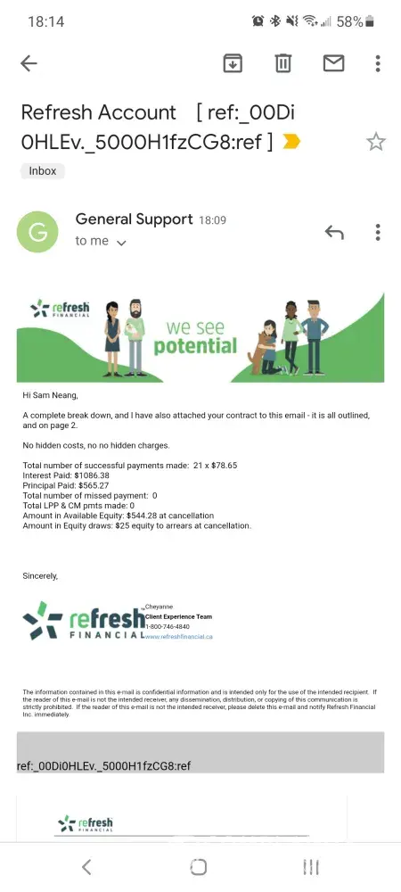 I requested to have a pay back of what I have paid since April 2020. I spoke with Ray an employee over there and he clearly explained to me I would be able to get the funds back once I decide to stop the program. So since April 2020 to February 24th 2021, I have made a total of 21 payments of 78.65$ which totalize to 1651.65$. When I requested a payout, they emailed me today saying the total pay back will be 544.28$. I figured that could be a mistake. Even with a 23.50% interest and whatever fees they charge (I think 16$ per months?), it shouldn't come up to 1107.37$ as interest and fees for 10 months? THIS IS AN INTEREST FEE BETWEEN 60% AND 70%! THIS IS NOT WHAT IT IS STATED IN THE CONTRACT! THIS IS WORST THEN A LOANSHARK! The agent Kahina finally called me up after countless messages on the Facebook messenger and also emails sent to them because they wouldn't give me a clear understanding and this is what she explained in the email: Hi ******** I requested a payment breakdown. Interest is calculated by taking the principle balance owing and multiplying it by the daily interest rate (the interest rate of the loan divided by 365 days in a year). The interest then builds up (accrues) until your next loan payment pays off the accrued interest and any fees. The remaining amount of the payment is applied to the principle owing, therefore increasing your available funds. All the best, Kahina So as per what her explanation in the email, the interest rate of 23.50% of 6000$ = 1410$ 1410$ / 365 days = 3.86$ per day 3.86$ x 30 days = 115.80$ per month They withdraw 78.65$ x 2 = 157.30$ per months 157.30$ - 115.80$ interest = 41.50$ that is paid toward the said capital per month (that I can get back) ***Please understand also that I have never missed a payment since day one.*** So basically, Refresh Financial get paid by their clients between 60% to 70% of interest on a loan that do not even exist! I thought by putting a higher amount would help more but no! the higher fictive amount it is, the higher the interest fees are! This is not right! Someone need to look into their practices because even in their contract, it is not clear! it says 23.50% on the capital amount but God I did not understand that it is per freaking day! I believe what Ray was saying in the beginning and read the contract and didn't yes it was confusing! this is a total scam! In conclusion, I am paying Refresh financial out of my own pocket 115.80$ per month so they could report it to my credit. And don't forget, the 6000$ is a fictive amount! I lost a total of 1107.37$ to this fraudulent company and I will never see it back. Especially during this pandemic, I can survive, but imagine those who worked hard for their money! This is beyond ridiculous! Even Fairstone who charges so much interest doesn't charge that much and they actually lend you the money!