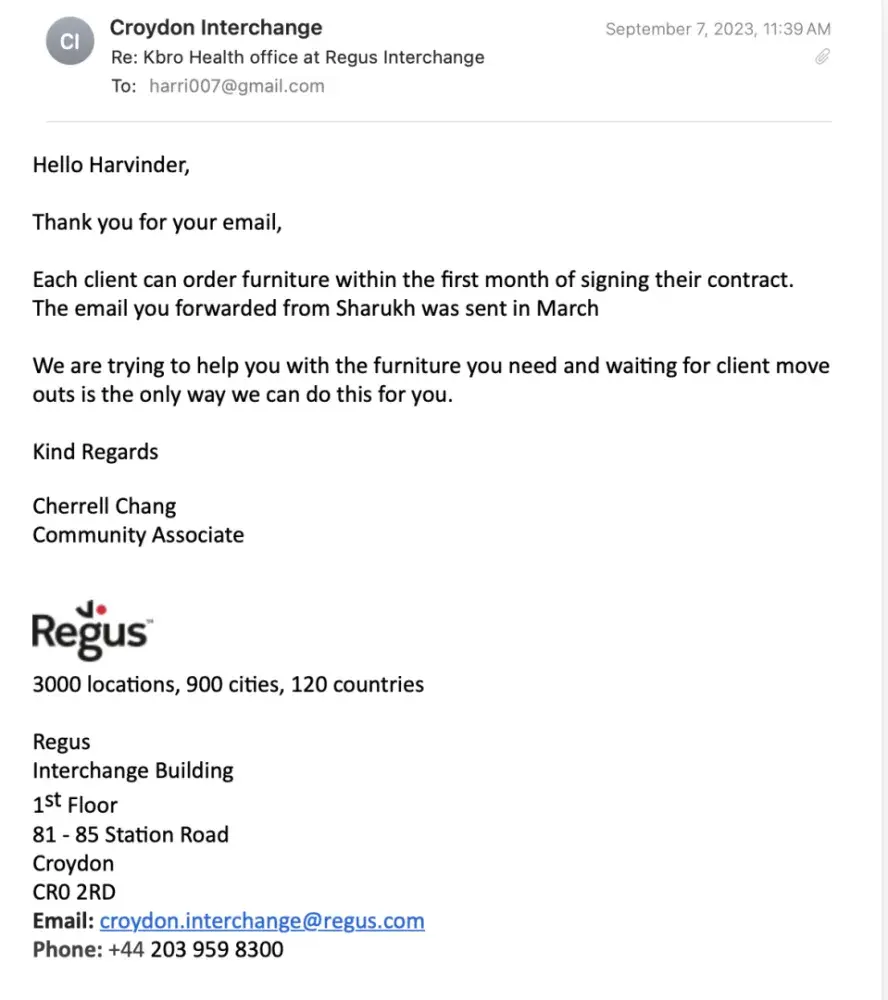 Regus failed to provide me furniture as agreed in the deal so I'm didn't about use the office for 4 month in the 6 months contract signed