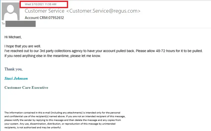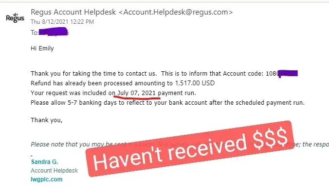 5. When asked about the collection agency, Regus first responded that this was a mistake and told us to ignore. To the follow up enquiry they stated that the claim would be cancelled within 48 hours (as evidenced by the attached email). That was over 4 months ago. To this date we are being chased by the collection agency and are forced to retain legal counsel.