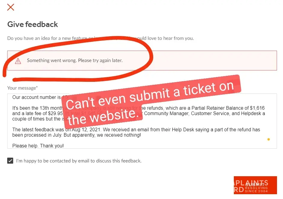 This is my third review on this board. Sadly, this is the only way for us to get any response from Regus customer service so far. Direct emails go unanswered. No way to contact anyone from the custom service via phone. Submitting a ticket through the help desk is a complete waist of time. The responses that come back don't make much sense and there's no way to follow up on them other then submitting another ticket... and on it goes.