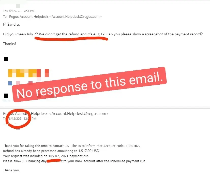 Regus sent a confirmation of termination email and email chain was also started about the refund for canceled services and retainer.