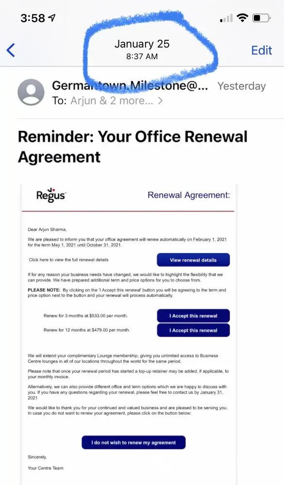 The bottom line: The Regus Corporate is unreasonable. First, this was technical errors on their part that I could not complete my notification with the link they sent me. Second, when I sent emails, no one at the local office who really opened my emails. No one answered the phone, they still can't receive my emails. It's obvious the only communication I have is via fax.