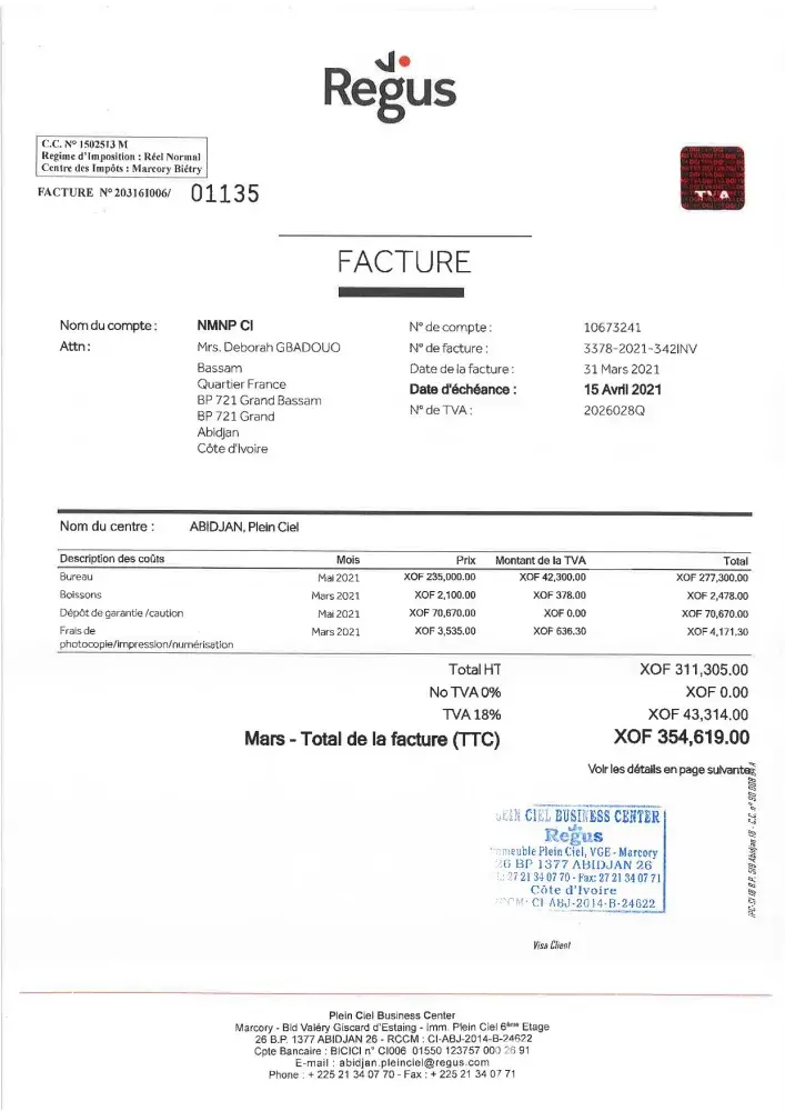 In April 2021 we received a different invoice than before -Ann.1- exp. 15/4/21 -(bigger amount) without any contact from Regus people.