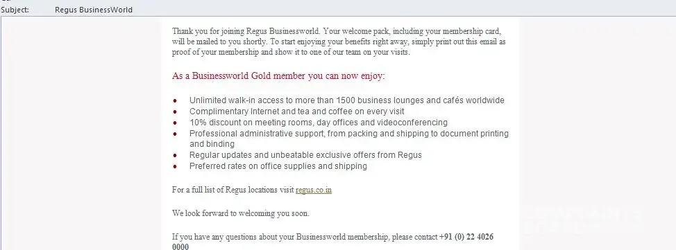 Thank you for joining Regus Businessworld. Your welcome pack, including your membership card, will be mailed to you shortly. To start enjoying your benefits right away, simply print out this email as proof of your membership and show it to one of our team on your visits.