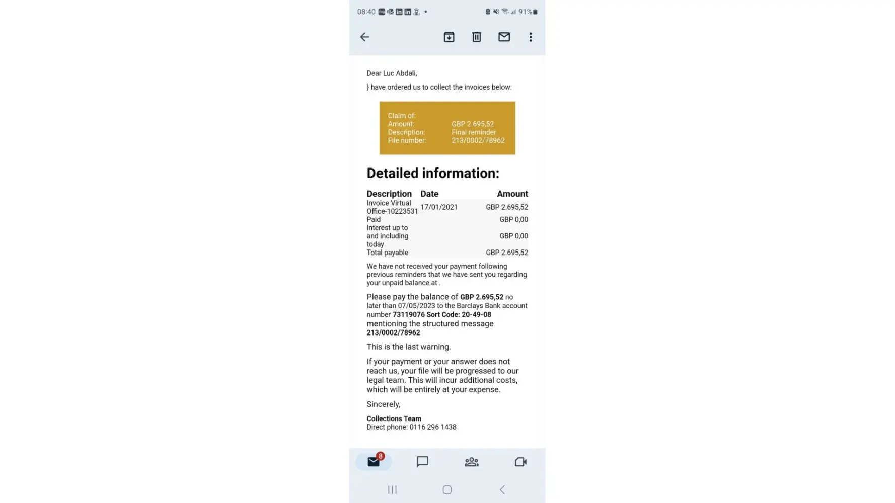 Hello and thank you for the replay. I hope this letter finds you well. I am writing to express my deep concern and frustration regarding the ongoing situation with your company, specifically related to the virtual office services provided by Virtual Office-[protected] since 17/01/2021. I want to clarify that I have never utilized your virtual address service before, and despite initial discussions, I did not proceed with the agreement and I never give my direct debit details due to unresolved issues with the contract terms. I have made multiple attempts to resolve this matter, yet I continue to receive threatening letters from a debt collection company, which is causing significant distress and amounts to harassment. I insist that you rectify this situation immediately to avoid further legal action and to seek compensation for the disturbance caused.