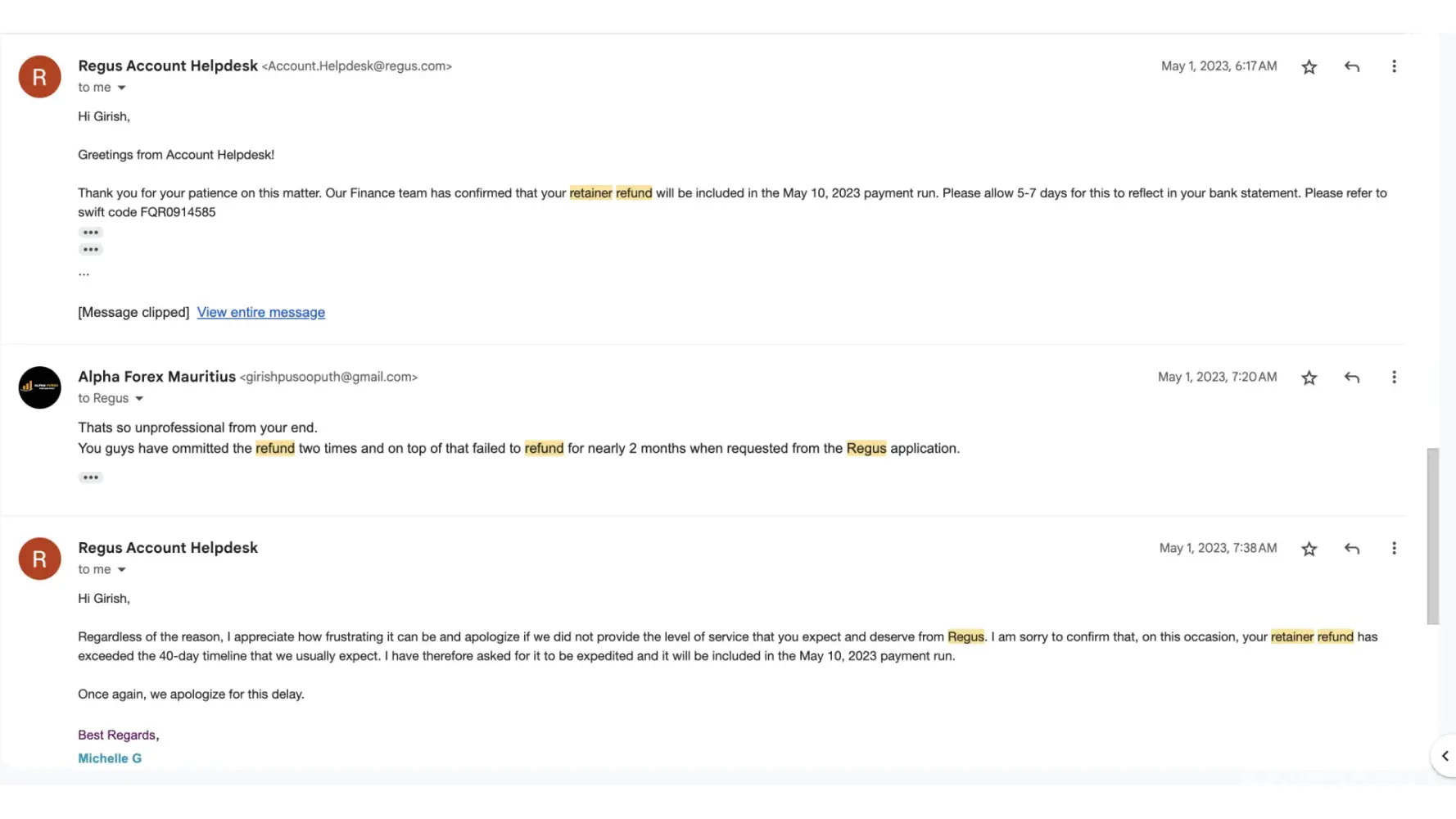 The below email is in response to my latest request for an update on my retainer refund past due. My retainer request was made in February 2023 and end of agreement March 31, 2023.