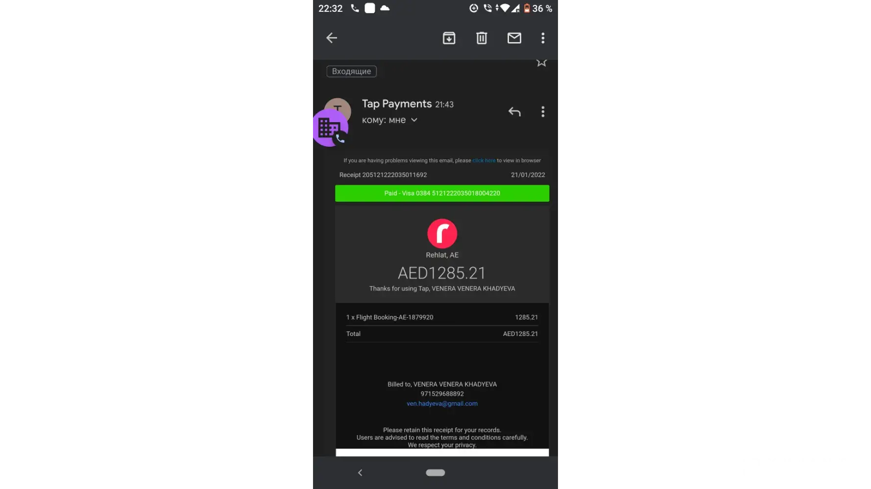 We Booked ticket 21 January 2022,The ticket we did not get due to technical Error.But Money was charged receipt is attached.we talk with fly Dubai we talk with tap payment system.the only money is taken by REHLAT company.i have bank statement & proof of receipt is attached I was charged. It's already been long time I am emailing a lot. But I did not get my money back. Please assist me to resolve this asap.