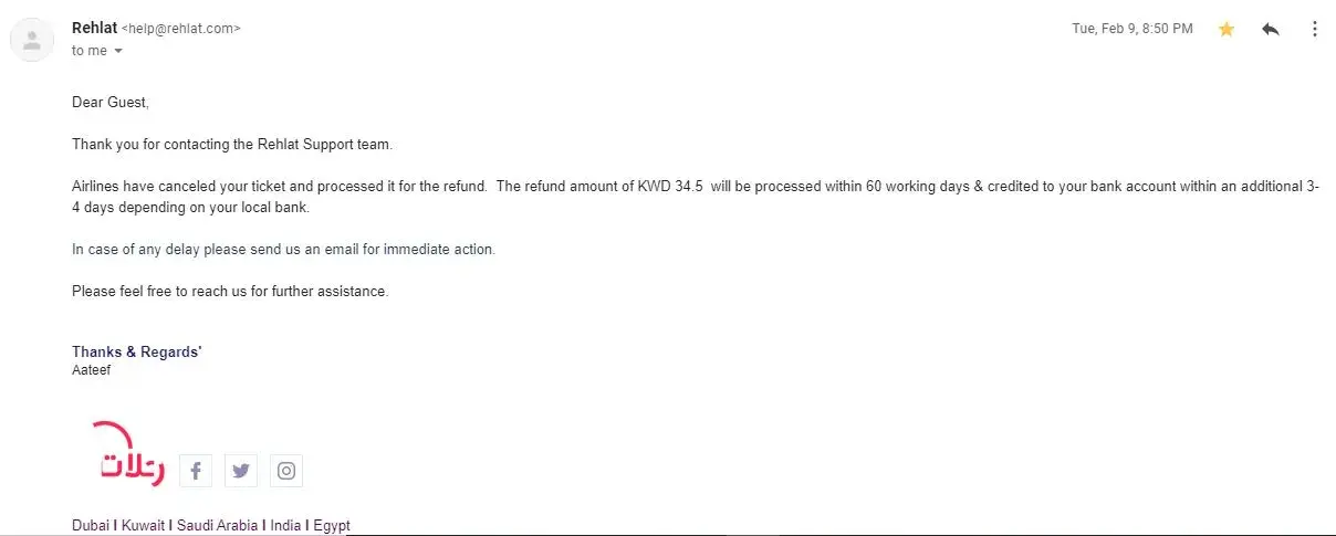 Actually my dad ticket was cancelled due to typing error which rehlat rejected to add surname of same person and I lost on cancelation charges too after which I booked my dad ticket directly from emirates airlines and that refund I got with in 2 months of refund request.