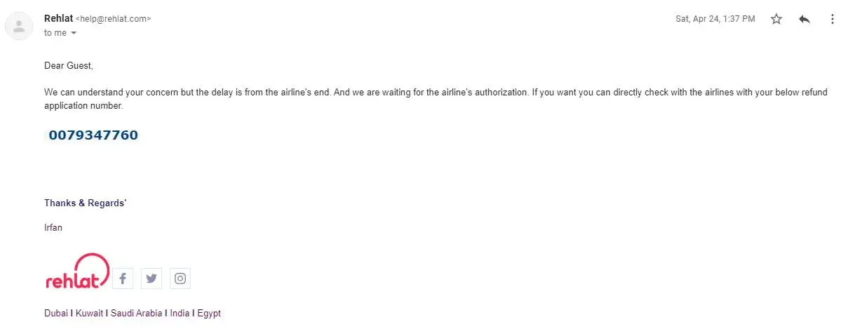 The airlines have made the payment to Rehlat and I have the proof as i knew the CFO of airlines but Rehlat has not made any refund to me.