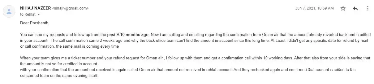 I booked ticket on Sep 2019 for Oman air though rehlat and got cancelled in May2020 due to Covid-19. I applied refund for my ticket to rehlat on July 2020 and after that I followed over mail and phone call over one year. I put up mail around 66 mail send to the team for refund. they did not give me a positive reply from their end. once they said will refund the amount after 60 working days. after that nothing is there. As per the refund request number given by Rehlat I call and put a request directly to Oman air, after one month I got a reply that the amount has been transferred. I informed the same to rehlet team and till checking with back office last 2 months. when I am calling only customer support attending call and they are not forwarding my call also.