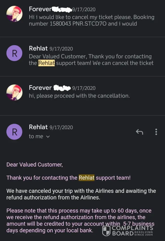 Rehlat promised in December 2020 that they shall refund the ammount within 60 working days but failed. The airlines have already refunded the ticket charge to all direct booking passengers.