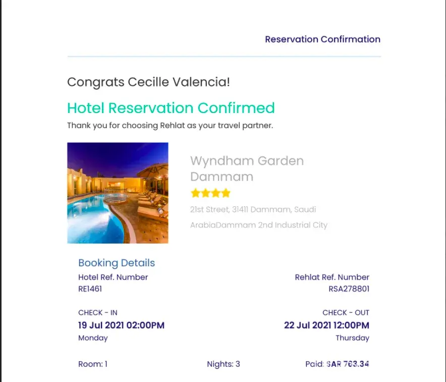 I arrived in the hotel (Wyndham Garden, Dammam) knowing that my booking is confirmed. I showed my booking confirmation to the hotel receptionist, but apparently she cant find it in their system. I contacted the Rehlat customer service in Egypt because the one here in Saudi Arabia's phone is off. I waited for more than two hours and to add to my disappointment the Rehlat staff wanted me to pay first my 1 night stay in the hotel which the hotel management didnt agree. I have to leave and get a flight back to Riyadh where I came from. It was disappointing! I have to resolve the issue by myself and the Rehlat customer service dropped my call. Its hard to contact the Rehlat customer service! I wasted my time and effort and I'm looking forward to refund what I paid in the hotel because the payment was deducted from my account already.