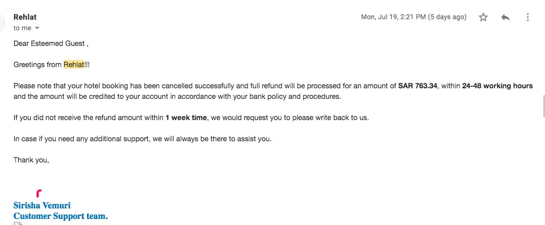 My hotel booking as planned using Rehlat.com got cancelled due to their internal issue.