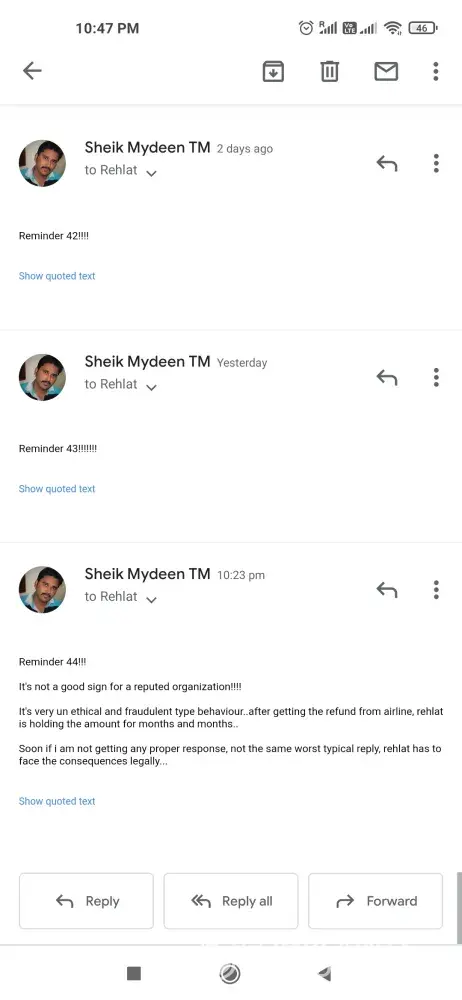This is my 51st follow-up email for getting my refund money. My airline already refunded full amount to Rehlat account mid of August 20 and I am still chasing you to get my money back.