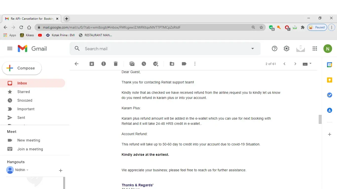 I am tired of writing again and again on the same matter. I am attaching rehlat mail to airlines dated 17th march that I will not be traveling due to covid. How can I be shown as no show when I already cancelled with rehlat team I haven't got any refund till date