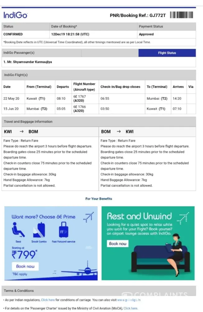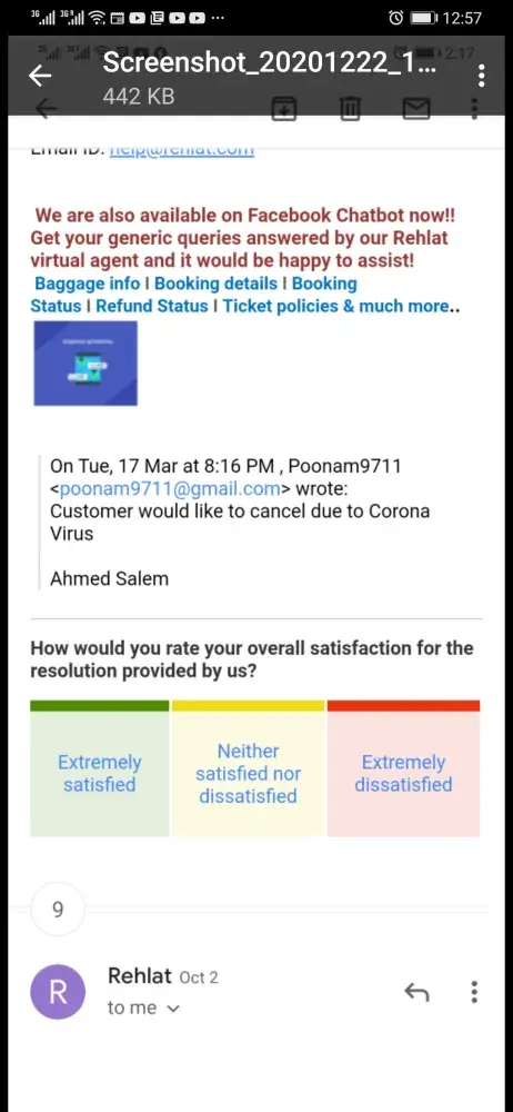 The airlines says no show, but I had called rehlat on 17th march and asked for cancelation. Screen shot of mr ahmed stating that the passenger will not be traveling due to covid, then how airline can say its no show. When I called the airlines I was told to call rehlat as my booking was thru rehlat, I informed on 17th march that I will not be traveling due to covid, in that case I should get refund for both ways at the earliest as it's been 11 months.