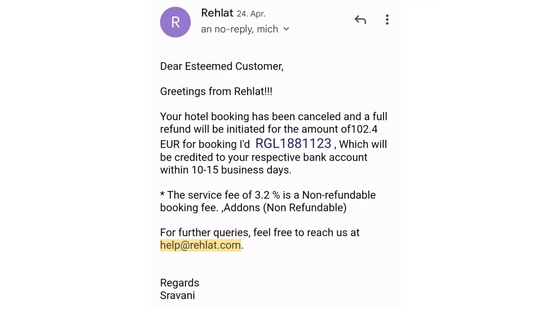 Please find below the email of Rehlat to my agent after cancellation of booking.