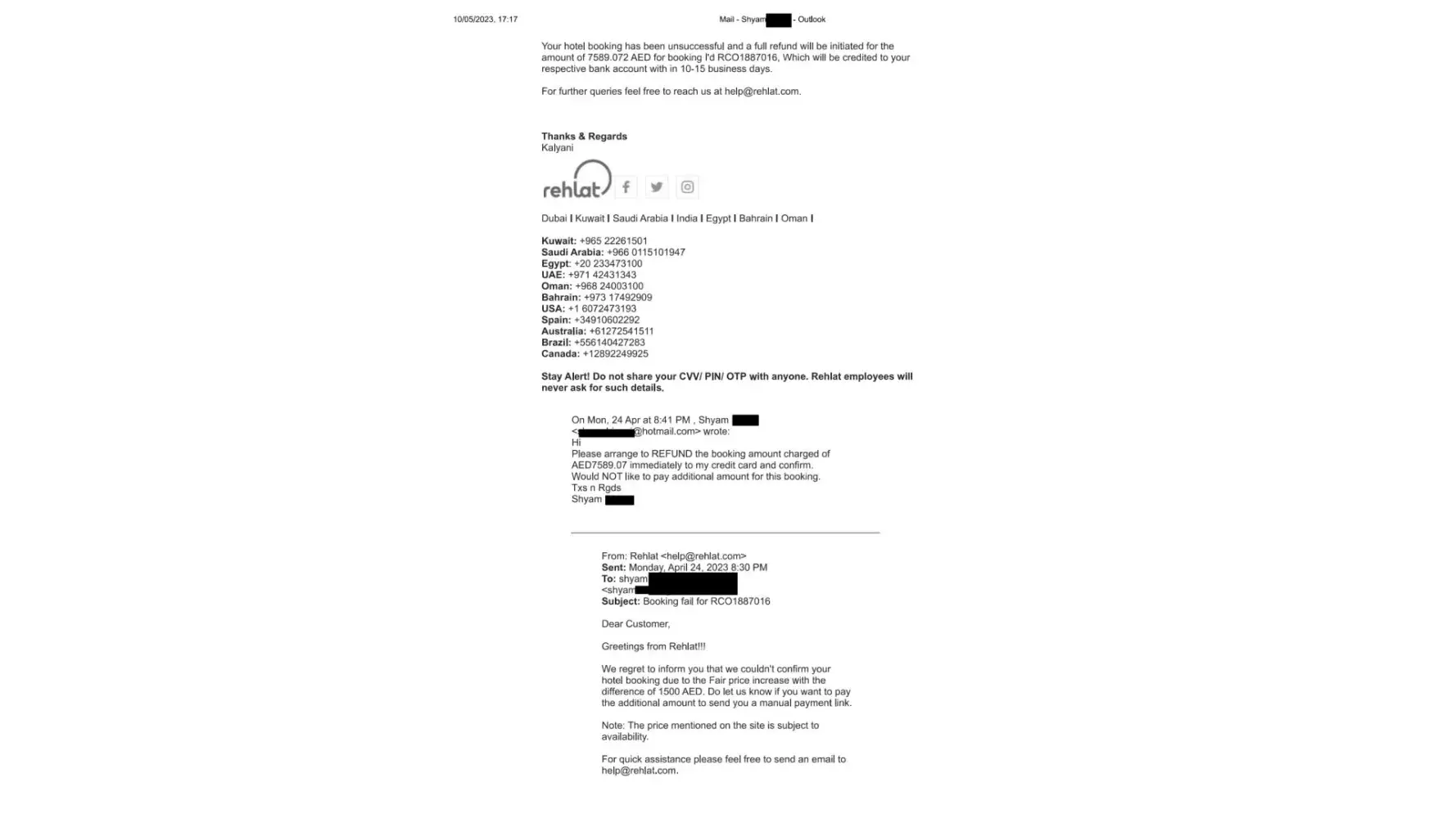 have no other option but to wait and then perhaps file a consumer complaint with the Dubai's Department of Economy & Tourism as rehlat also seems to be registered in UAE at Internet City. Still waiting with hope that they will process the refund. My Booking ID was RCO1887016.