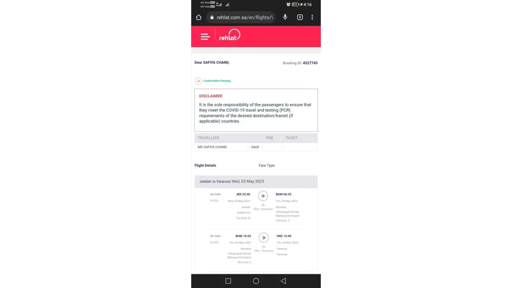 Do not book any flights or hotels through the Rehlat app or website. They are tremendous liars. On June 8, 2023, I purchased a ticket from Kuwait to Mumbai for June 23, 2023. However, at the same time, they removed my money and only one booking id was created. I haven't received a phone call or a letter in the last seven days.