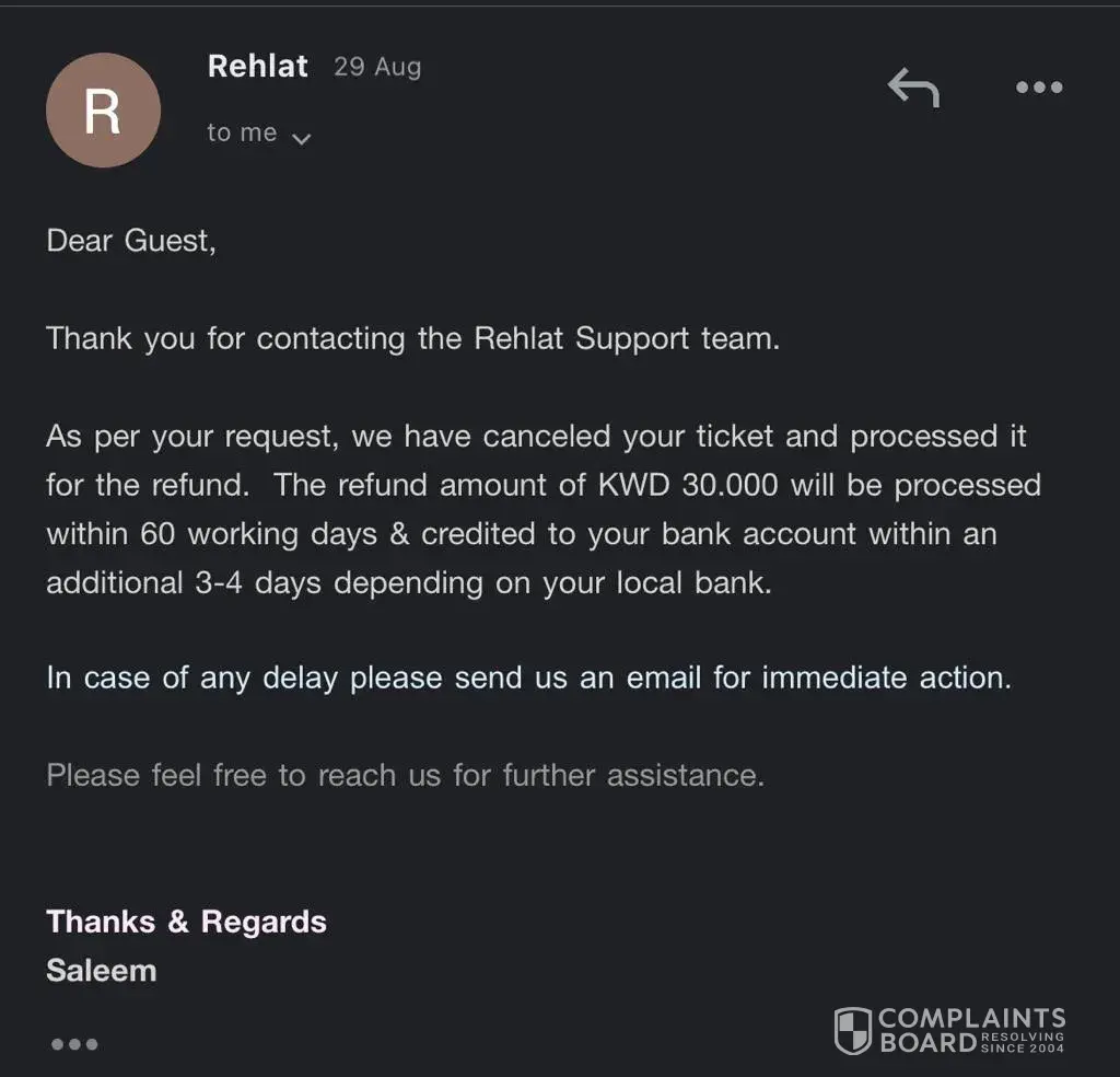 On June 29 2022 we purchased tickets on Rehlat. On June 30 2022 they cancelled it and said we will get a refund within 60 days. We haven’t received our money back despite our weekly phone calls with them asking them to refund us. booking ID: 3917226