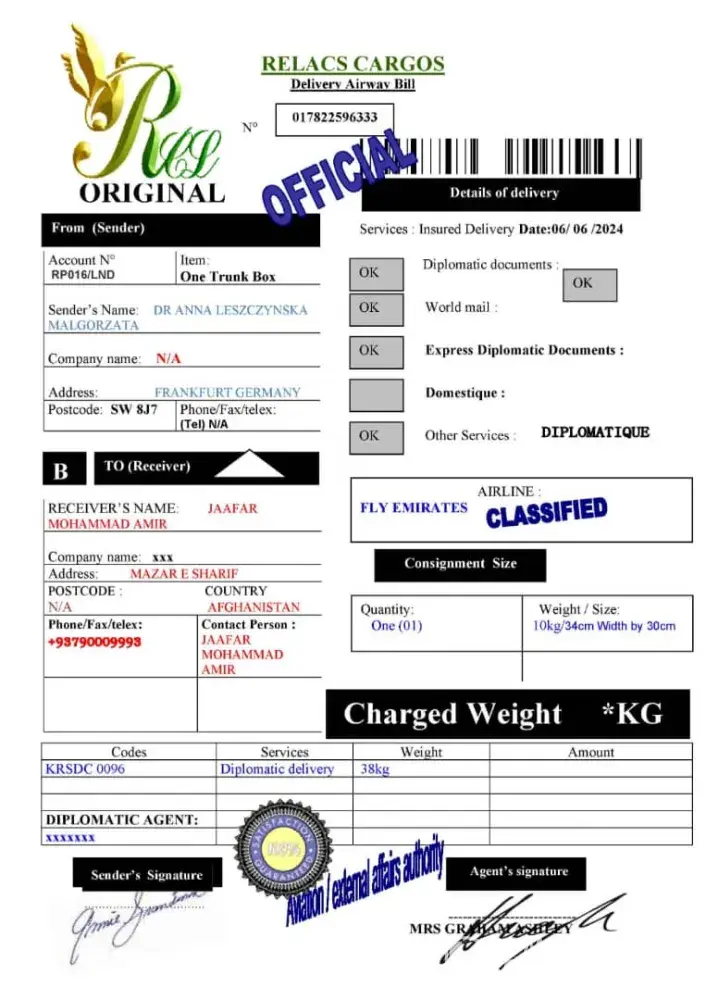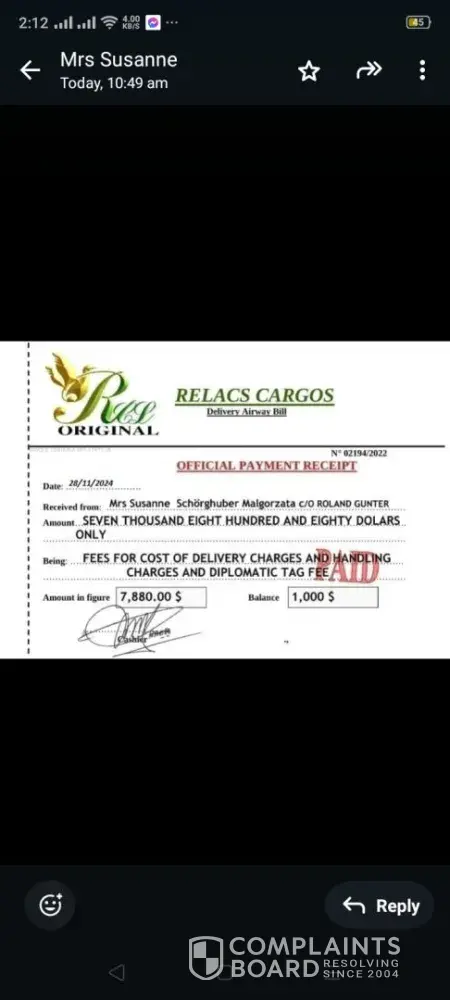 Sir a friend of mine through Relacs Cargo Some important items sent to me by this company have not reached me yet Please tell me whether this company is registered or not and can he get my valuables back to me Please help me. For information, let me tell you that she has passed away, she is no more in this world and that is the reason why I can't even contact her now.And no one else knows about it. The goods were sent from Germany to Pakistan and I am a citizen of Pakistan.And my friend's name was Dr. Anna lycezynka And her address was Frankfurt Germany