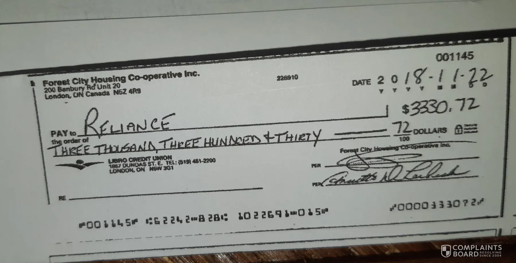 Unfortunately, when I actually wrote out the check I made it payable to Reliance in error. Please note we have never been in arrears in the amount of $3330.32 with Reliance.