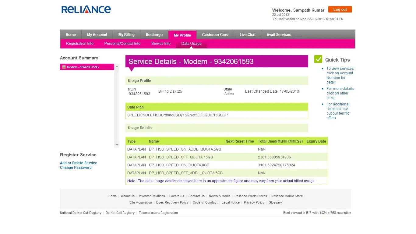 i m murlidhar loya log in id is-[protected] using ur broadnet since last 1 year, therefor yesterday i was call to ur customer care bcoz of my late payment details, and thr was a issu also tht my cheque was rejected so my net facility was dissconnected by ur system, so tht i was called to ur callcenter i was talk with mr.govinda he told me tht if u pay atleast 1787.35 rs will service will restart, as per his instruction i paid 1790 rs (recipt no-s166007776), then i again call to ur customer care n ask when my net will start, then thr was a person who is superior, he told me tht we cant giv u ours representatives complaint no, i just asked him why u / ur co.gives me falls information, then he said u can do wht u want we do not take complaints of our representative