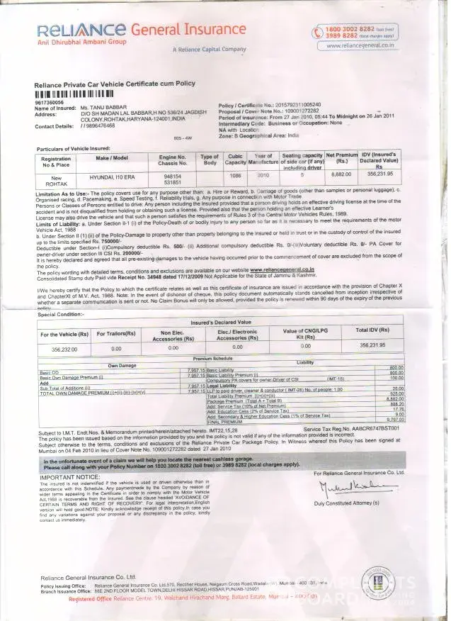 Period of Insurance:-27 Jan 2010, 05:44 to midnight on 26 Jan 2011
