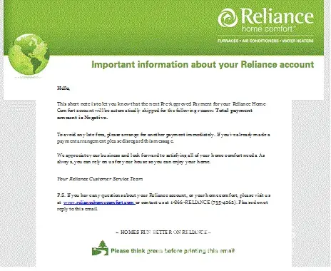 I went through a Reliance Home Discomfort abusive billing as well. They called out of the blue a year or 2 ago asking if I was interesting in a home furnace service assurance for a nominal service charge which would be covered by a rebate for the first 6 months. Fine. The bill was so small...at first. It slowly increased the following year and then I was sent multiple bills at different prices. I called them and tried to cancel and was told I had to send them a letter in the mail to cancel. Good enough...after digging through their paperwork there was no apparent address to cancel so I called them back and they told me I could cancel by sending an email. They gave me an email address and I sent off my cancellation.
