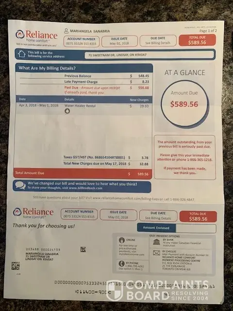 We woke up one day in the winter last year and our water heater that existed with the home we purchased had failed. We have 3 small children and have no option but to call someone to help with replacement as it was -20 outside and we have a exchange furnace that uses hot water to heat the home. Reliance was the only option for immediate need. Upon contacting them, sales rep came and sold us a new tankless water heater. He advised that he would give us a "discount". Monthly payments were arranged and he had me sign his computer for agreement. The document was then emailed to me after signing. At no time did he disclose the term, details or options for the contract or advise to anything with regards to terms and conditions. It was a simple, here's the product, here is the cost, sign this and give me your credit card number.