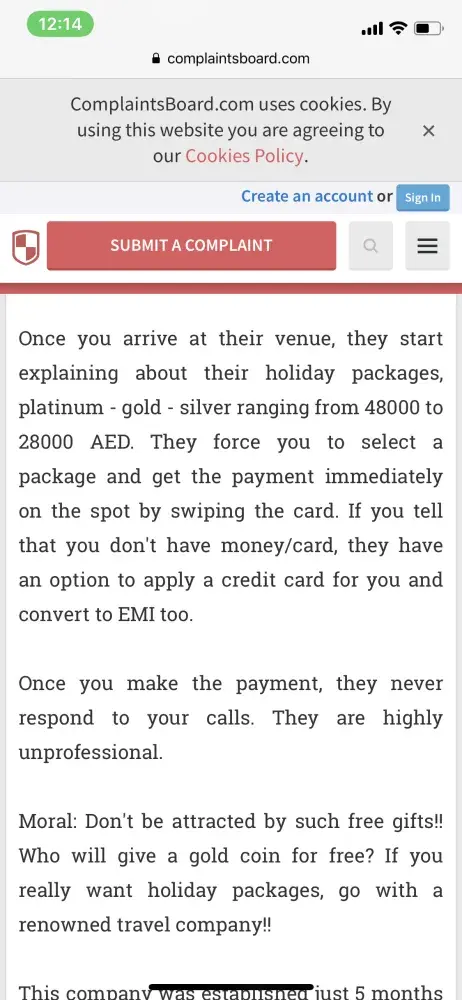 They are calling us you win gold 1 gram gold coin asking us to come. thay are saying that you take this vaction package they are collecting bulk amount they prefer cash if not thet are asking credit card if we dont have they are arranging from adcb bank and and they forced to pay we paid half amount 6000 aed from credit card after reaching home we saw the reviews weasked them to refund amount and we said that 1 gram we will return i dont want to proceed to pay another half but 2 months gone we are paying emi the dont care they making us to follow behind them.after paying half amount on the second day after seen reviews we were asking money but two months gone they are making us trouble we are paying emi but our money with them. they are not giving us .we are about to file a complaint any of you joining with us pls drop ur contact on this mail id [protected]@gmail.com