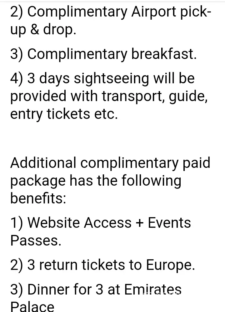 How this is called a scam: and my mistake. I don't know about this company how log they are in UAE, the way they inviting in Room for present the package is unusual, the way they want the payment on the same time is Risky and the way they are chasing the people is really seems scam. I requested to all please don't go in such activity. I don't know Reliance is actually having a contracts with Hotels or they are fake people only sent 2/3 families on trip May be they sent their staff or partners on vacations on the money the illusionist they gathered. Why I am saying it illusion that in normal senses no body will take such silly decisions.