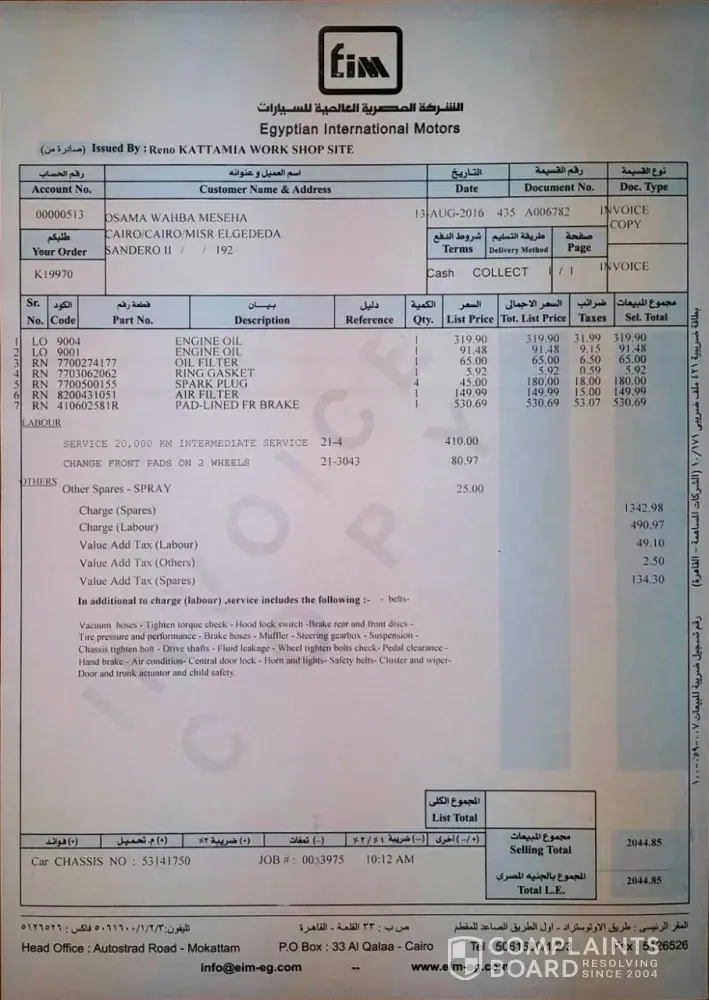 I'm complain Renault Egypt's agent of the bad service as a results of low experience and their trying to earn more money for wrong issues, what had been happened with me that they asked me with every 10, 000 km. maintenance to change the front Brake which is not correct 100% and with the last maintenance (50, 000 km.) they asked me that i have to change both of the front break along with the front break disk
