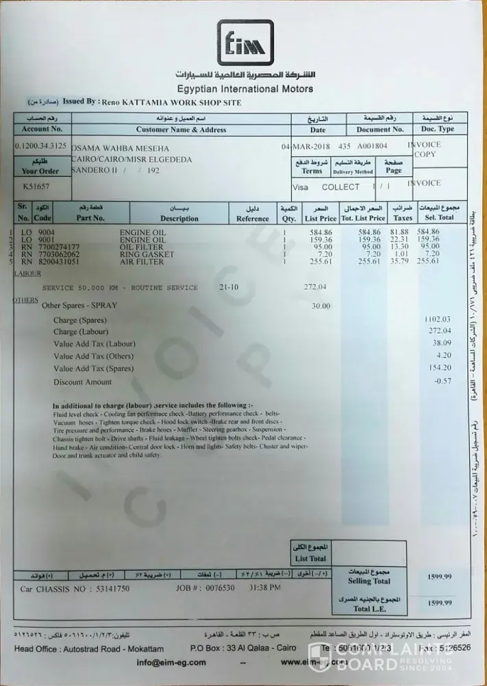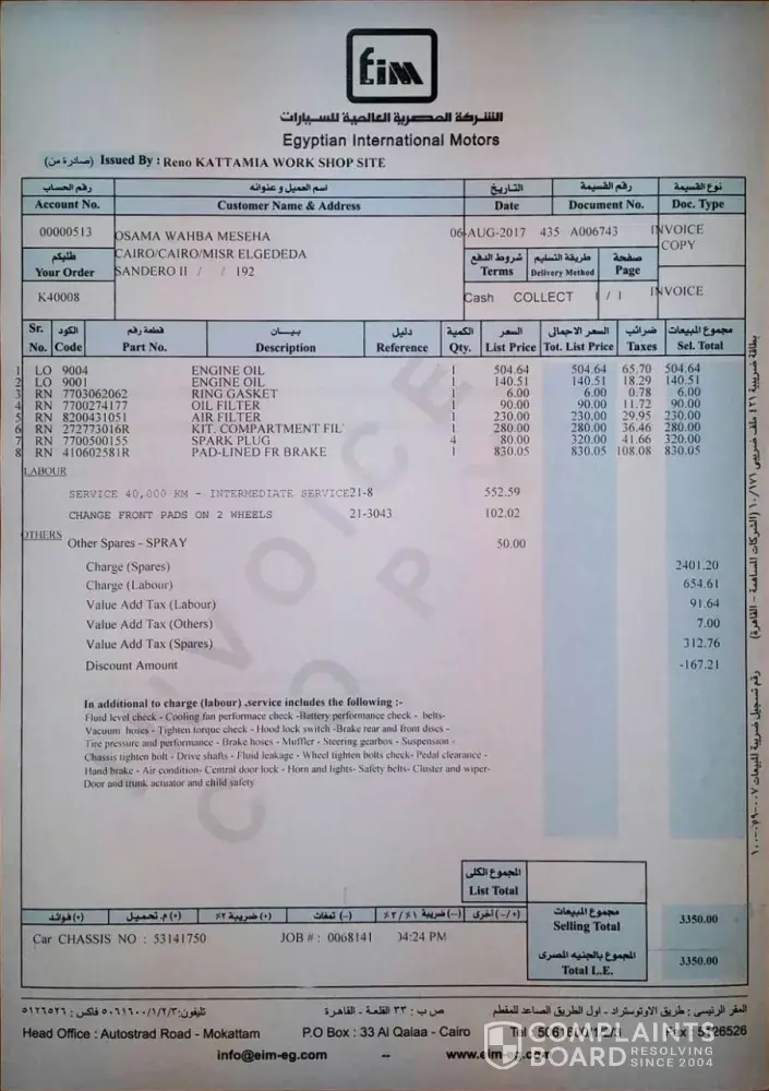 وعليه وثقت السيارة واستلمتها بتاريخ 18-12-2017ولرغبتنا ÙÙŠ الاستمرار بصيانة السيارة بالمركز المشكو ÙÙŠ ØÙ‚Ù‡ الثاني، توجهنا Ù„Ù„ÙØ±Ø¹ الجديد بمنطقتنا مدينة السادس من أكتوبر بذات اليوم Ù„Ù…Ø¹Ø±ÙØ© الموقع والاستمرار ÙÙŠ الصيانة من خلالهم كمركز معتمد لدي شركة رينو.