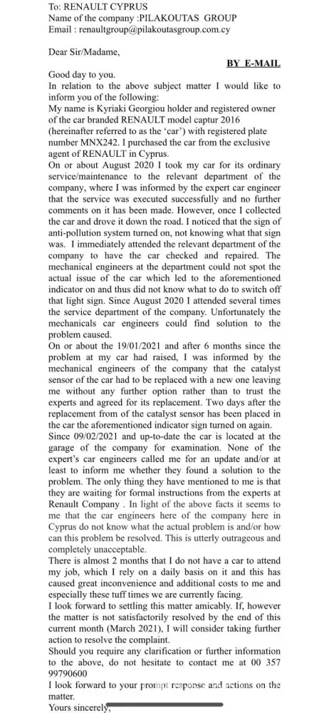 What I want is no longer this car. It's given me and my husband such a bad taste in the mouth that we really just want to park it and cut our losses really, I trust you'd understand how I feel with all said above. This whole thing really caused such a lot of misery in my life. My husband however would consider a trade in on a second hand car registered in his name and also payment, because I am done with this and cannot anymore hit brick walls. I am so ethical to my agreement with Renault that through everything I never once skipped payment and still pay every month.