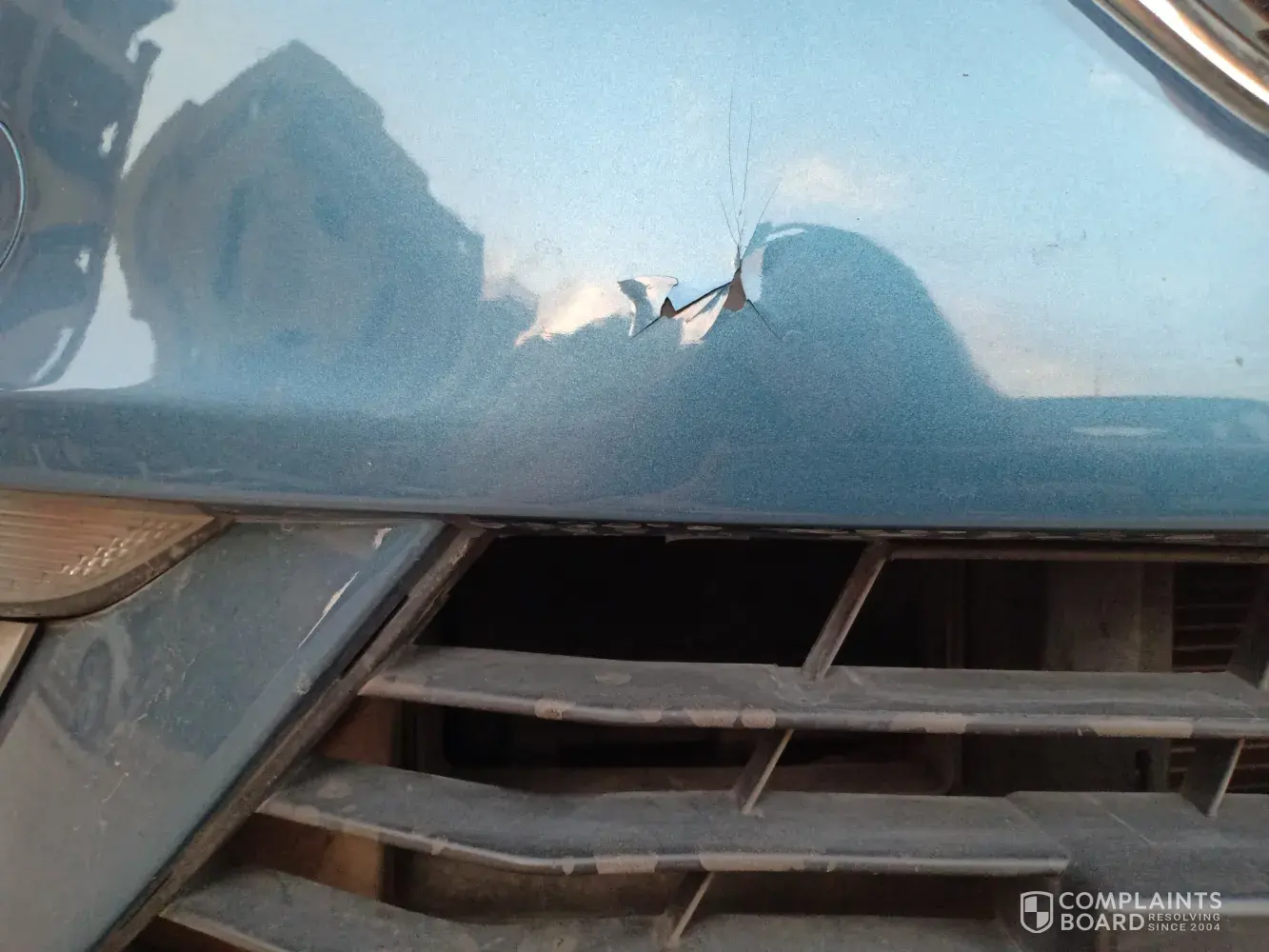 Today, I finally had the time to properly write this complaint. The front bumper painting that cracked now started to fall as you see in picture number two and the bumper itself is not well fixed in place as you see in picture three and four. There's no word that can describe my regrets to buy a Renault, I love my beautiful Megane and I always loved the brand but with a service center like that who knows if they really use original pieces or proper materials, so surely my new car will not be a Renault. This is not my first incident with the service center, back in September 2020, the car battery died on the high road while I was traveling after approximately a week or two from my 30, 000 km maintenance. My bad, I didn't file a complaint for that but I remember calling the customer service that night to check the warranty status and the price of a new battery, records and system will prove it.