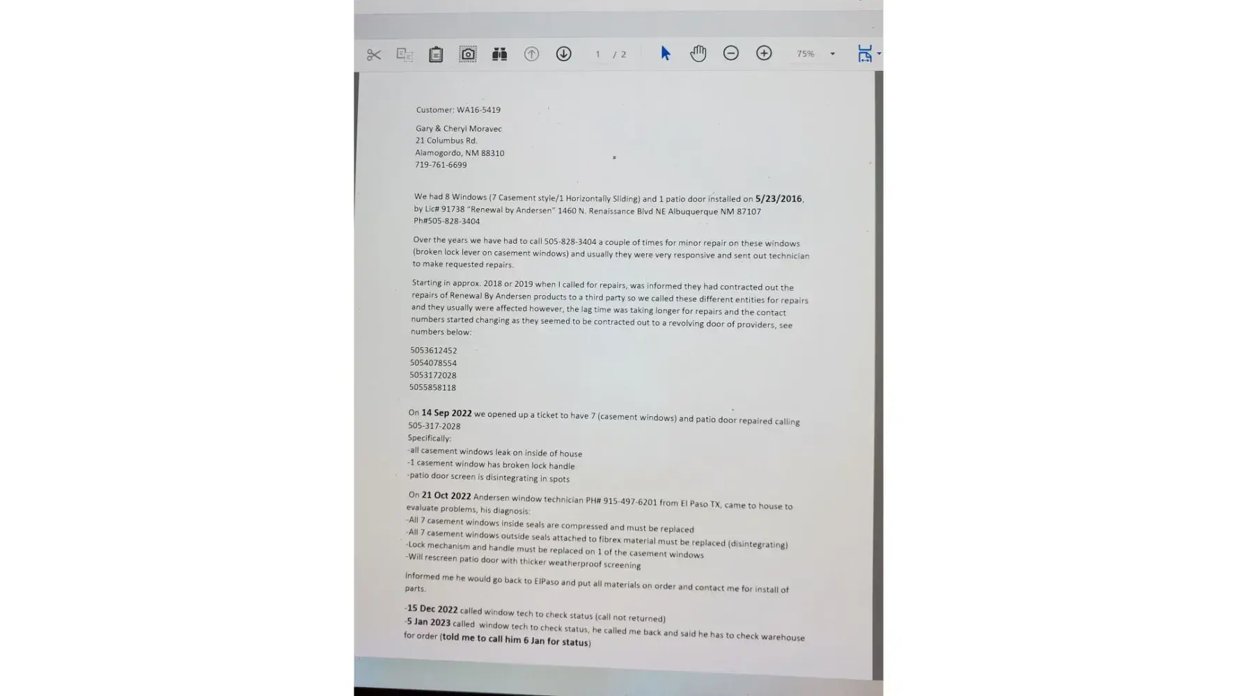 On 14 Sep 2022 we opened up a ticket to have 7 (casement windows) and patio door repaired calling [protected]