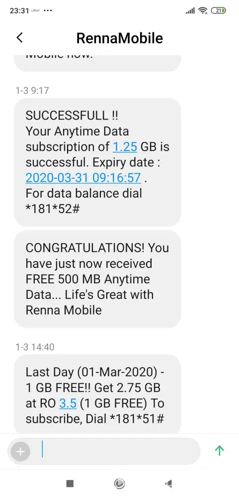 I recharged my mobile with sms pack of 2RO on 4th March 2023 to open my bank muscat net banking.