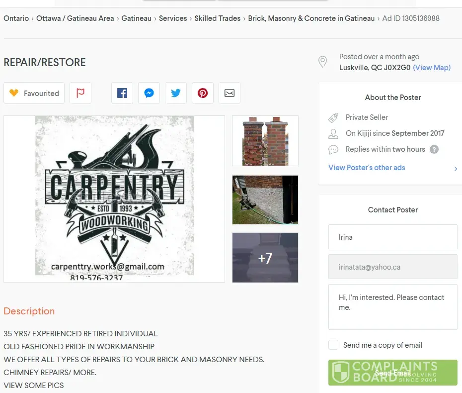 We filed a case with the Gatineau police as we were certain that he had done this to other individuals. The Gatineau police did nothing despite the detailed accounting and photographs we provided. They indicated it was a civil matter. From the date of these posts, it looks like he is still committing fraud and ripping people off four years after he ripped us off. The Gatineau police should have stepped in.