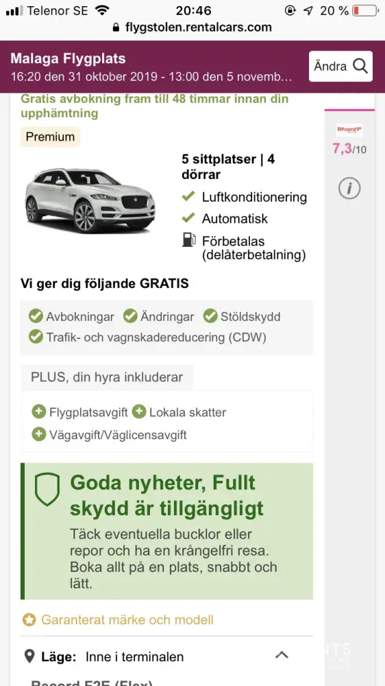 I booked a Jaguar F-pace between the 31st of October until the 5th of November. According to the website the make and model should be guaranteed (see attached screen shot). I called to you and got this confirmed the day before pickup. However, at the arrival at Malaga airport I was provided with a Range Rover Evoque. A completely different car than I was promised.