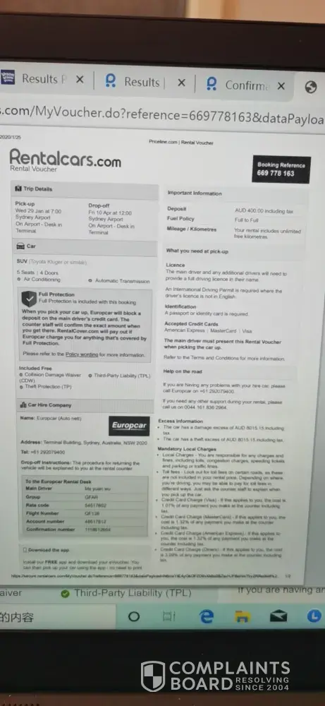 3. I have to cancel my booking at Sydney airport Australia, since I refuse to accept the car that Europcar was trying to replace for me and they would have different size and type of cars offered however refused to review the price that I have paid and lowering the costs since the difference.