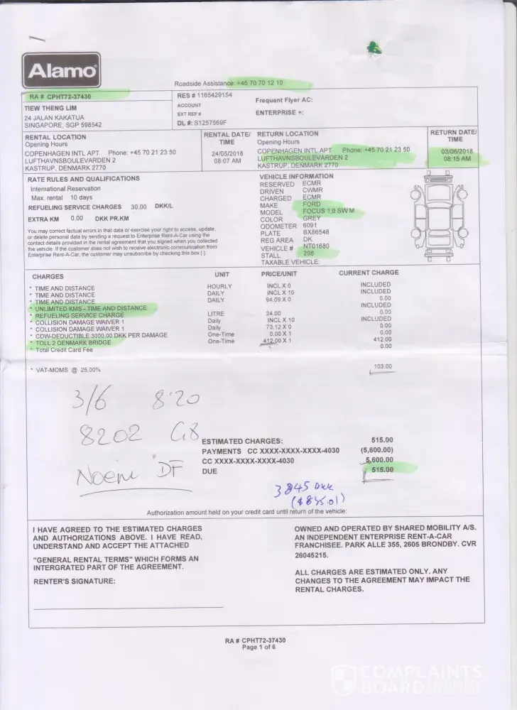 On 3 Jun 2018, the vehicle was returned. Alamo staff had similarly told me about 515 DKK would be charged.