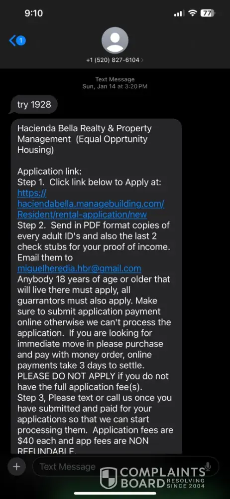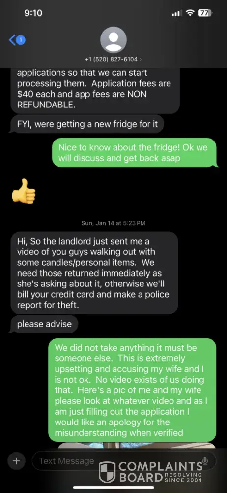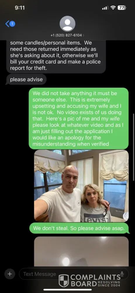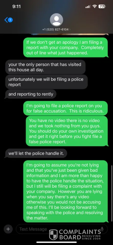 Also after sending the picture of us he called me and told me that picture I sent could be from a year ago. That is what really was upsetting. I then took a video of my wife and I showing the date and time on her phone and perpetuated the texting. If this person had actually seen any video from a Landlord then he would not have been accusing us. I can only assume he was told something by a Landlord and assumed we were to blame. Furthermore the house we visited was literally empty not even a fridge in the house. Bare. On a counter in the kitchen I remember a realtors picture and business cards that’s it. And again, if anyone has any video I wish they would review it and see us and prove they have the wrong people. They could easily verify this but instead call me and my wife and text us accusing us of stealing and saying they’ll file a police report and report us to Rently. I filed the same compliant to Hacienda Bella property management as I realized it might have been them not a Rently person. So both complaints are the same to each company.