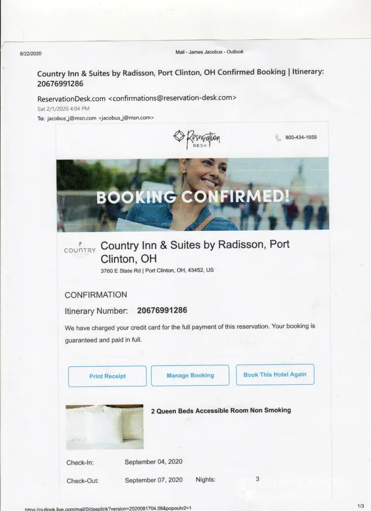 On February 2, 2020, I made a reservation on the Country Inn & Suites website for a stay from September 4, 2020 to September 7, 2020. When the reservation was complete I received a confirmation from Reservation Desk.com which I believed was associated with Country Inn & Suites. On August 20, 2020, I called Country Inn & Suites to change the reservation to...