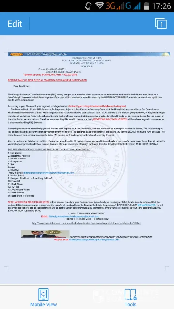 The foreign exchange transfer department (Rbi) hereby bring to your attention of the payment of your deposited fund here in the rbi, you were listed as a beneficiary in the recent schedule for payment of the past edition email/mobile number award incurred by the british government, which is yet unclaimed up-till date due to some circumstance.