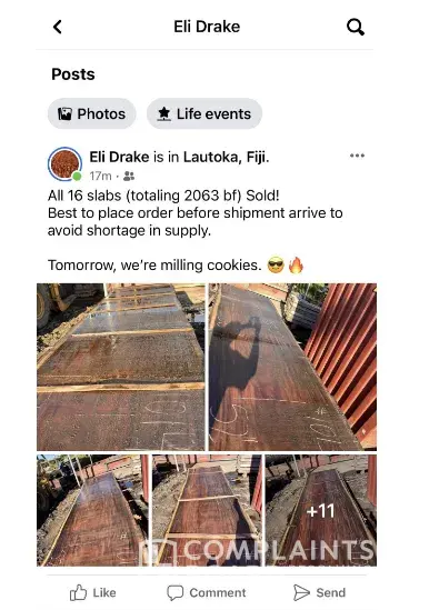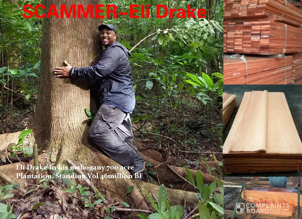 This Black man Eli Drake is a scammer,he cheated 3 chinese customer's deposit in fiji raintree contract in 2016,2017 and 2018. without delivery and ran back to usa and sell the mahogany and raintree in usa with a rent house ,also send the lumber/slab to some retails ,be aware of your pocket ,dont waste time to deal with a devil man like this.all the chinese victims can offer contracts and bankslip also eli drake's passport with different numbers ! Hope americans not help such cheaters with his fake business.