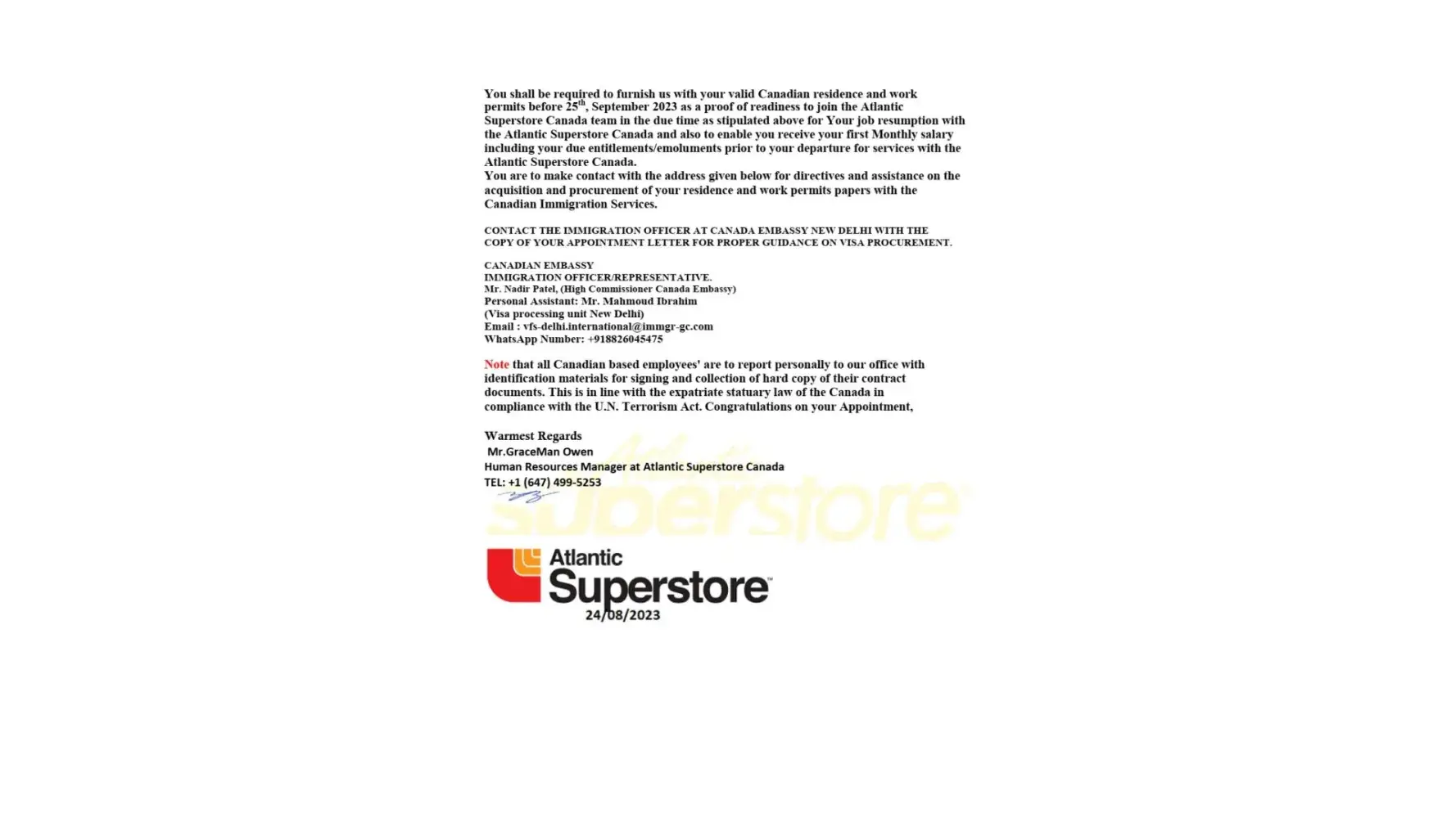 Atlantic Superstore Canada - Atlantic superstore job offer letter/ appointment letter