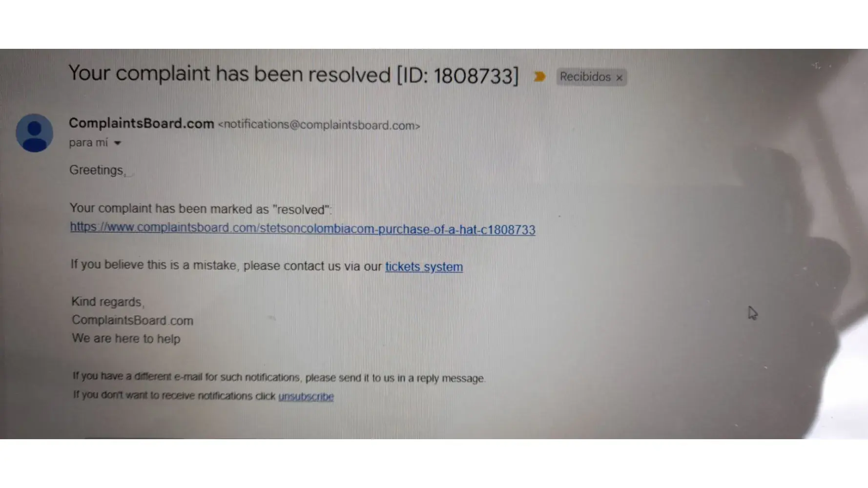 The complaint has been investigated and resolved to the customer’s satisfaction.