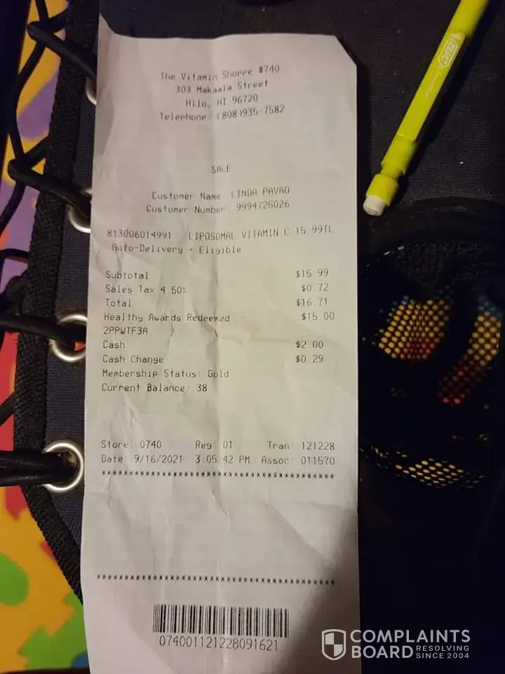 Thursday 9-16-2021 3:05pm Today I went to purchase one bottle Liposomal 60 capsules. I attempted to use my debit card, the clerk said to try again. It didn't go through. I made a second attempt and still it didn't go through. I said that's ok I'll pay cash. The clerk told me I am due for a Reward in $15.00. I said ok I want to use it. I felt disturbed...